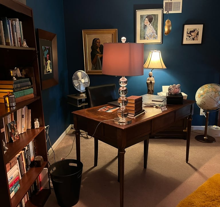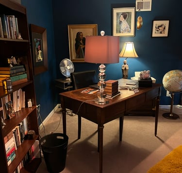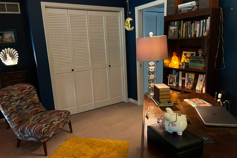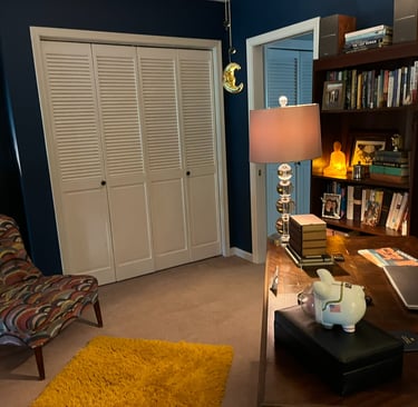 This space is so versatile. It has changed purpose over the years: home office, reading nook, exercise area, and back to an office once again.