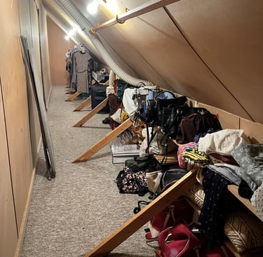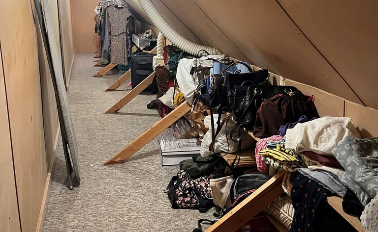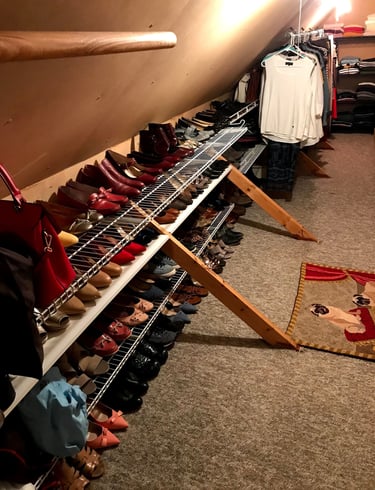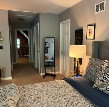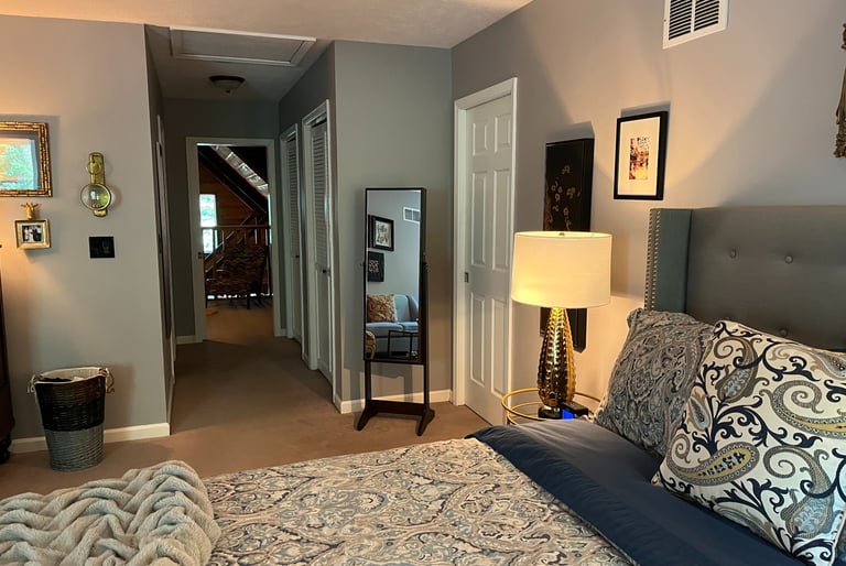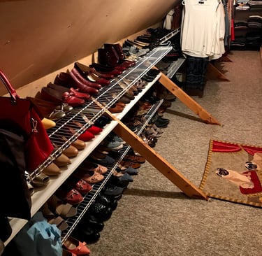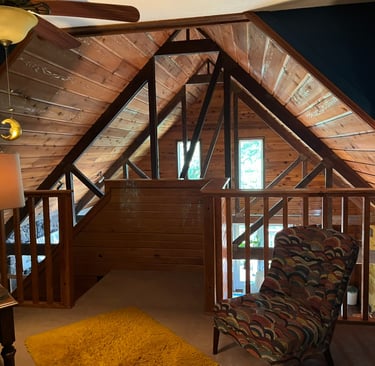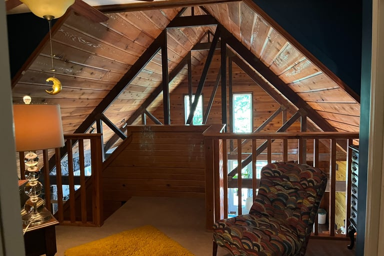 In addition to the two walk-in closets under the eaves pictured below, there are two shelved folding-door closets in the hallway from the loft to the bedroom and an additional folding-door closet with shelves and hanging space in the loft.