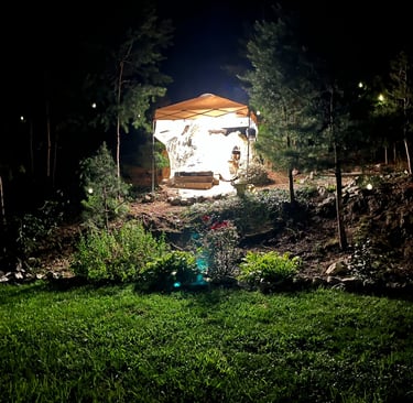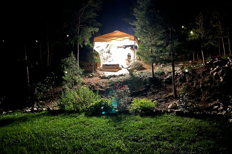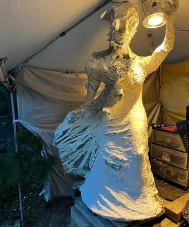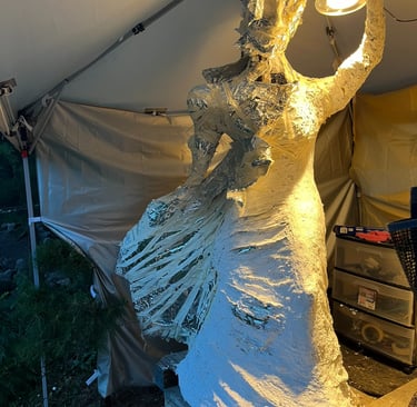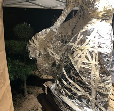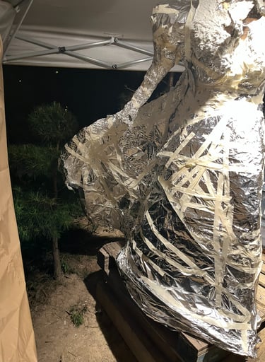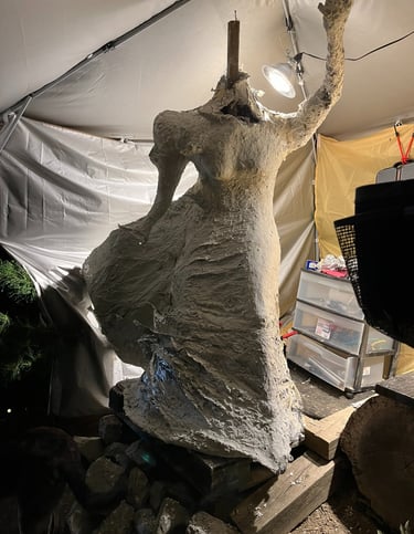 I began sculpting the legs and lower torso with wire, foil, and tape, but realized that rain would wreak havoc on the paper maché/ concrete mixture and I had better put a canopy over her. This turned out to be a GREAT idea for other reasons as well: I hung a fan and lights and so I was no longer limited by weather or darkness to work on my project.