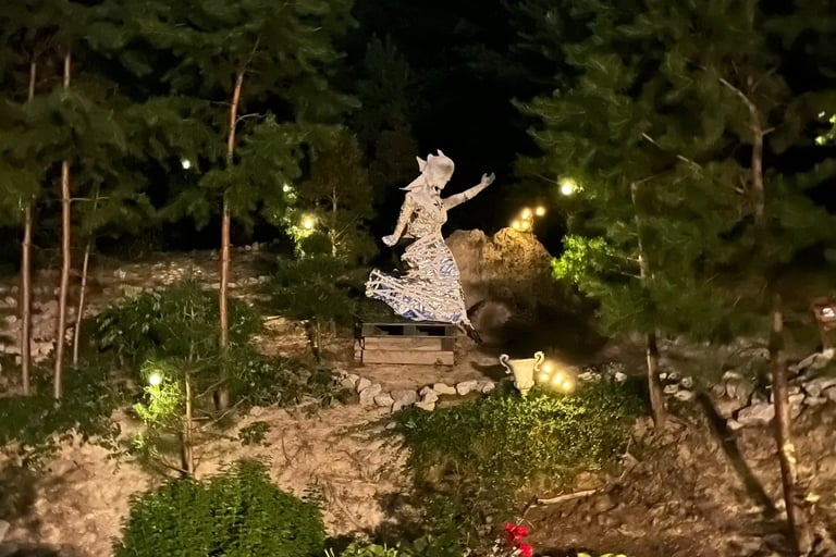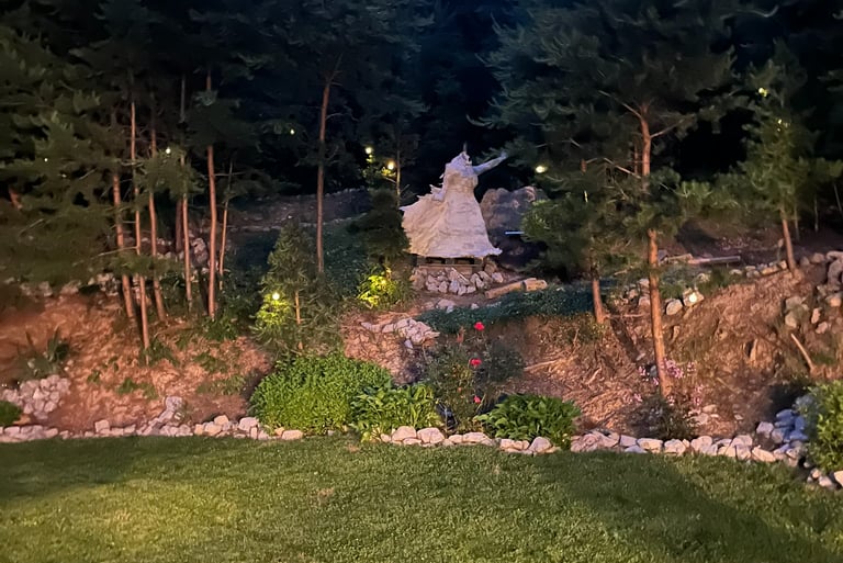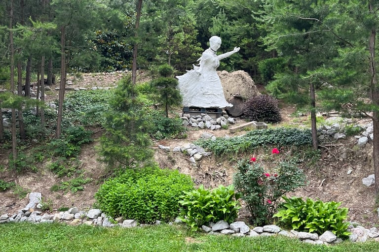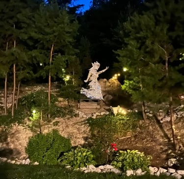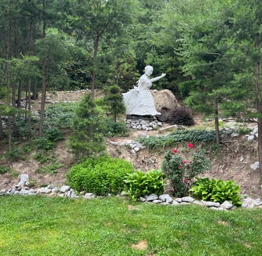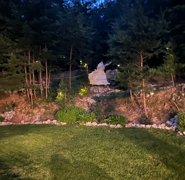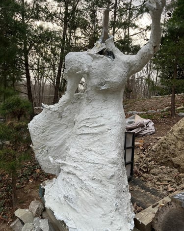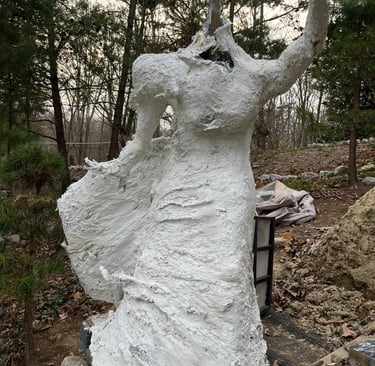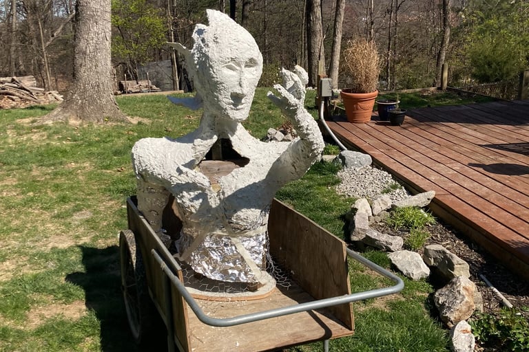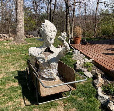 After a few weeks, I realized that the statue-in-the-making was getting too big to get through a doorway and too heavy for me to lift. I wrangled her out of my basement work room and onto my wheelbarrow in the garage. On his ensuing visit from Colorado, my now-husband helped me build a foundation and install the torso on the hill.