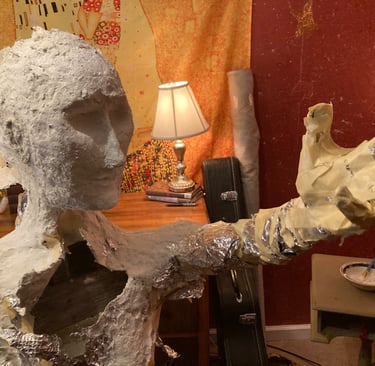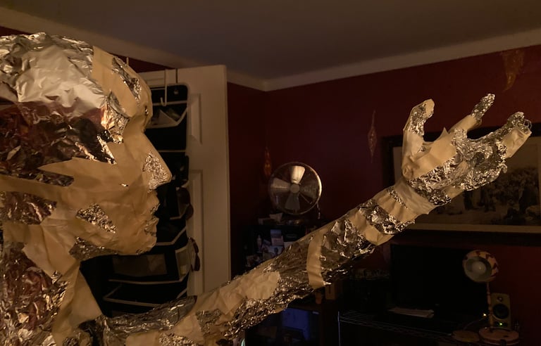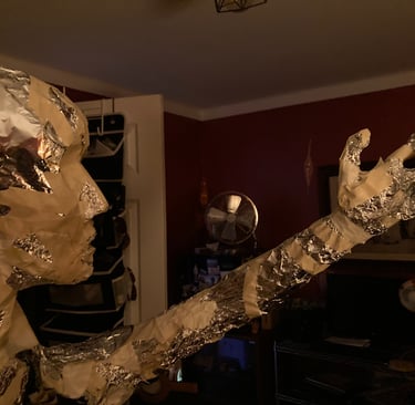 Though I mostly used scrap wood and hardware I had on hand, and toilet paper, foil, and masking tape from Dollar Tree, other ingredients weren't cheap and due to her size, the cost was mounting. I had already bought the canopy to protect her, and Portland White Cement was hard to come by and rather expensive. I also used GALLONS of glue and drywall compound.